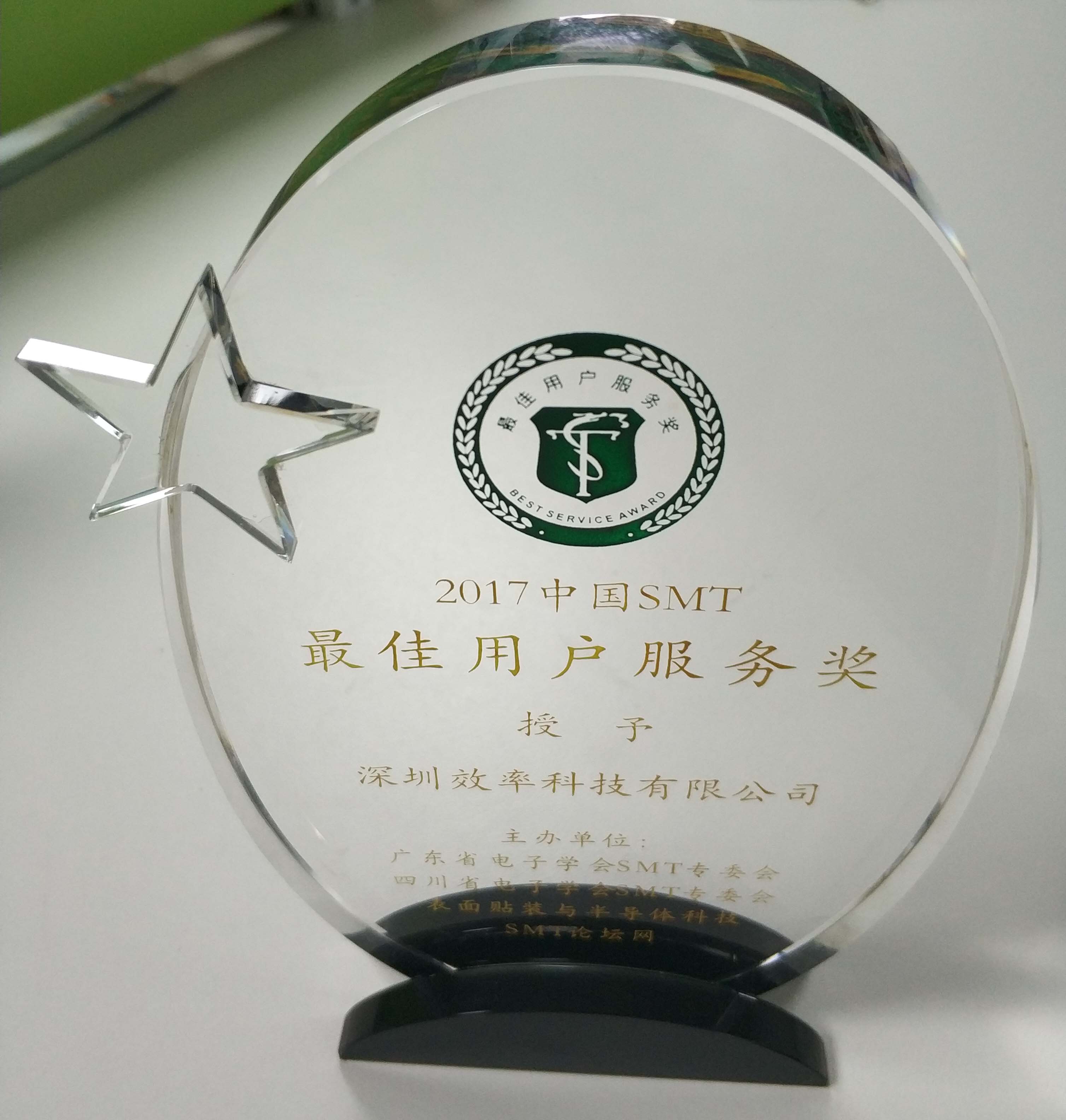 繼2015年我司獲得“中國(guó)SMT創(chuàng)新成果獎(jiǎng)”之后,2017年,我司又榮獲了中國(guó)SMT “最佳用戶服務(wù)獎(jiǎng)”。這表明我司不僅擁有雄厚的技術(shù)研發(fā)實(shí)力,我司優(yōu)質(zhì)的售后服務(wù)質(zhì)量也得到了客戶的贊賞和認(rèn)可,在服務(wù)類別中脫穎而出拔得頭籌。