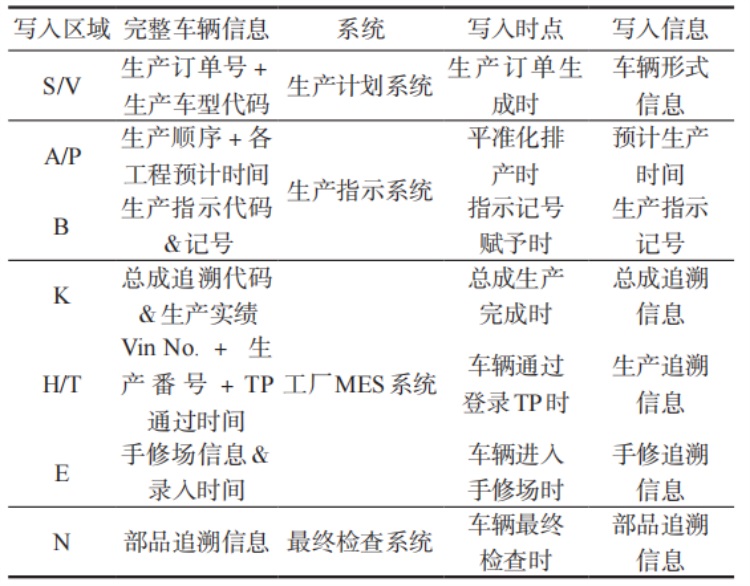 表 1 是車輛SF(日程文件)信息錄入的過程,簡單來說,就是在不同的生產階段在車輛SF的相應區域中登錄車輛基本信息、生產信息和品質追溯信息。