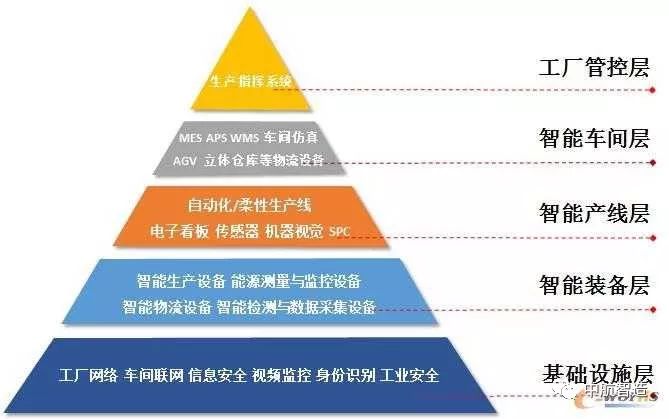 智能工廠可以分為基礎(chǔ)設(shè)施層、智能裝備層、智能產(chǎn)線層、智能車間層和工廠管控層五個層級: