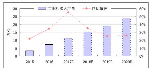 目前我國涉及生產機器人的企業數量超過800多家,且有大批傳統繼續制造企業轉向工業機器人的生產,我國已建成或在建的工業機器人園區超過40個,還有大量籌備中的產業園區,預計將在未來幾年陸續建成投用,將進一步釋放工業機器人產能。因此,預計2018年,我國工業機器人產量將達到15.2萬臺,同比增長約35%;2017--2020年,我國工業機器人產量年均增速約為35%;到2020年,工業機器人產量將接近23.9萬臺。
