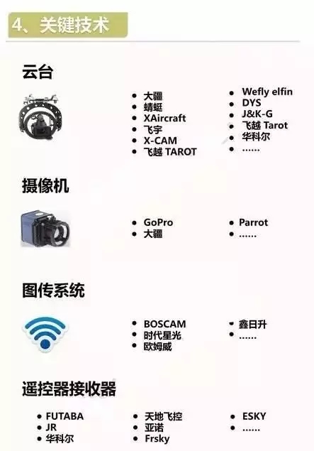 無(wú)人機(jī)產(chǎn)業(yè)鏈可分為研發(fā)、生產(chǎn)、銷售、服務(wù)等細(xì)分領(lǐng)域,具體可分為產(chǎn)品研發(fā)試驗(yàn)、飛控系統(tǒng)開發(fā)、發(fā)動(dòng)機(jī)等關(guān)鍵零部件生產(chǎn)、任何載荷制造、無(wú)人機(jī)整機(jī)組裝、無(wú)人機(jī)銷售、無(wú)人機(jī)操控培訓(xùn)、運(yùn)營(yíng)服務(wù)業(yè)務(wù)、一體化應(yīng)用服務(wù)等環(huán)節(jié)。無(wú)人機(jī)產(chǎn)業(yè)鏈參與者主要包括兩類:一類是像大疆、GoPro這樣的整制造商;另一類則是為無(wú)人機(jī)提供硬、軟件的上游制造商,包括芯片、飛控、電池、傳感器、GPS、陀螺儀、動(dòng)力系統(tǒng)、數(shù)據(jù)系統(tǒng)、圖傳系統(tǒng)、電子元器件、無(wú)人機(jī)培訓(xùn)等等。