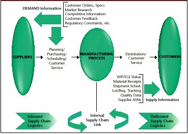 制造公司主要關(guān)注供應(yīng)鏈的三個(gè)主要環(huán)節(jié)。第一個(gè)環(huán)節(jié)是入庫(kù)物流,包括實(shí)際制造上游的所有功能,并專(zhuān)注于采購(gòu)和準(zhǔn)備制造。第二個(gè)環(huán)節(jié)是制造功能本身,其重點(diǎn)是設(shè)施,設(shè)備,勞動(dòng)力,材料和工藝。第三個(gè)環(huán)節(jié)是出站物流,主要關(guān)注成品和配送。雖然入站和出站物流鏈路往往以客戶(hù)和訂單信息為中心,需要大量有關(guān)客戶(hù),供應(yīng)商,訂單和貨物的信息,但制造環(huán)節(jié)往往是以流程和生產(chǎn)為中心的。